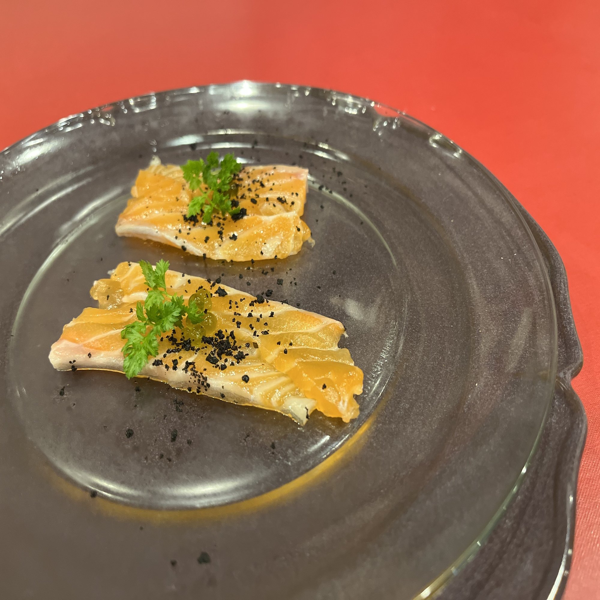 脂の乗ったサーモンと薫香、アクセントのオリーブパウダー。