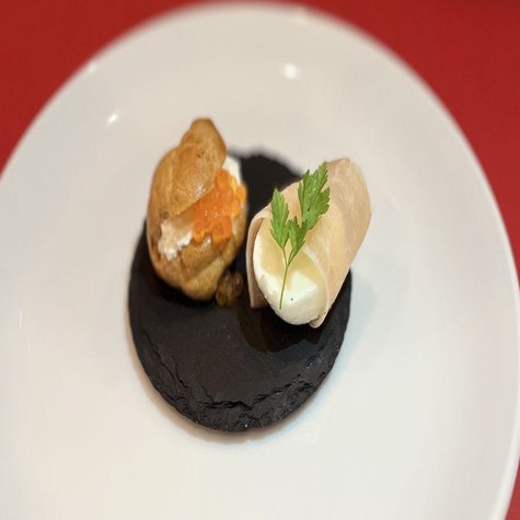 フランス南西部ピレネー山脈で育った、サーモンの卵と北海道産クリームチーズのムースを小さなシュー生地でサンドしました。