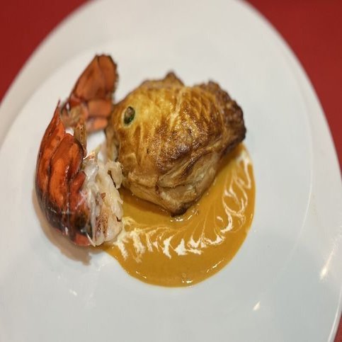 ■サーモンとホタテのムースパイ包み焼 ローストオマール添え