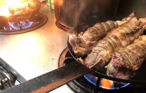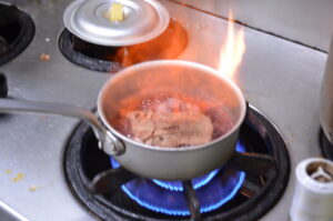 「煮込みは慌てず、じっくり、愛情を込めて」——師匠の言葉を胸に、成形して型崩れを防いだ飛騨牛の表面を強火で香ばしく焼き付け(リソレ)て旨みを閉じ込めます。