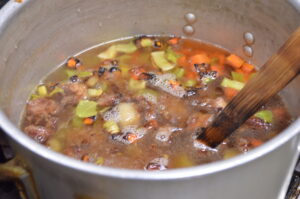 香味野菜はオーブンで焼いて甘みと香りを凝縮。大ぶりの寸胴鍋で飛騨牛と合わせ、沸騰させない火加減で約3時間じっくり煮込みます。
