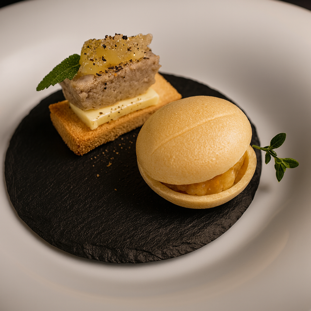最中皮をそっと噛むと、軽やかな「カリッ」。直後に、絹のように滑らかなフォアグラのテリーヌが体温でほどけ、りんごのコンフィチュールが清らかな余韻を添えます。
