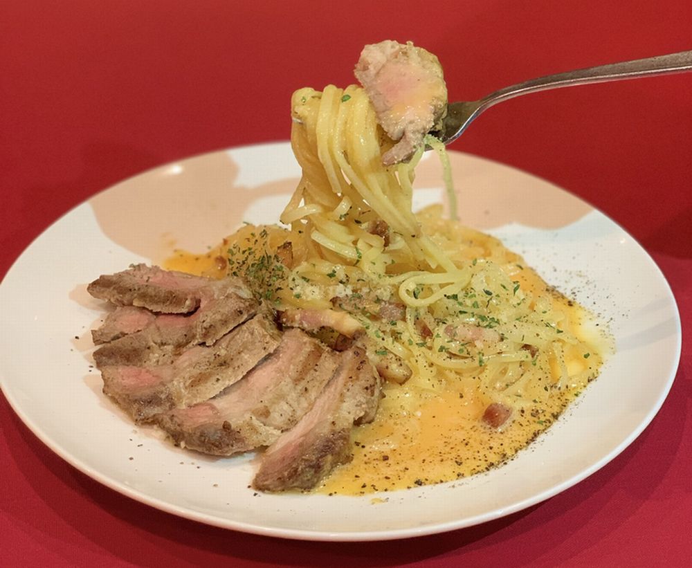 スペインのブランドポークイベリコ豚を強火で香ばしくグリル。濃厚卵と9ヶ月熟成したイタリア産のチーズグラナパダーノのソースで食べ応えあるパスタです。