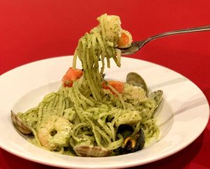 鮮やかなグリーンと爽やかな香りのバジルソースに海老 ホタテ ムール貝 あさりの旨みを凝縮しました濃厚に絡みつくソースと魚介の旨みがモチモチ食感のパスタと好相性です。
