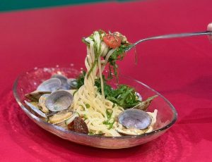大粒あさりがたっぷりの冷製パスタ旨みがギュッと詰まったアサリの出汁に、オリーブ油を加えソースにしましたとろりとしたなめらかなソースにモチモチの食感の生パスタがよ~く絡みます。大葉の風味が爽やかな、夏にぴったりの冷たいパスタです